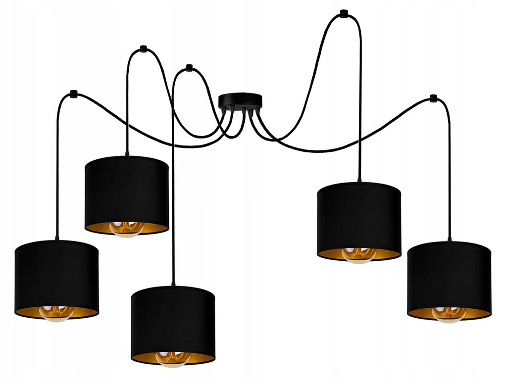 Eine Spinnen-Hängelampe, ideal für Küche, Esszimmer und Wohnzimmer. Aus schwarzem Metall mit Schirmen aus Stoff-PVC und einer goldenen Innenbeschichtung. Mit verstellbarer Länge und unabhängigen Stromkreisen. Ein modernes Design, das Ihnen Funktionalität und Stil bietet.