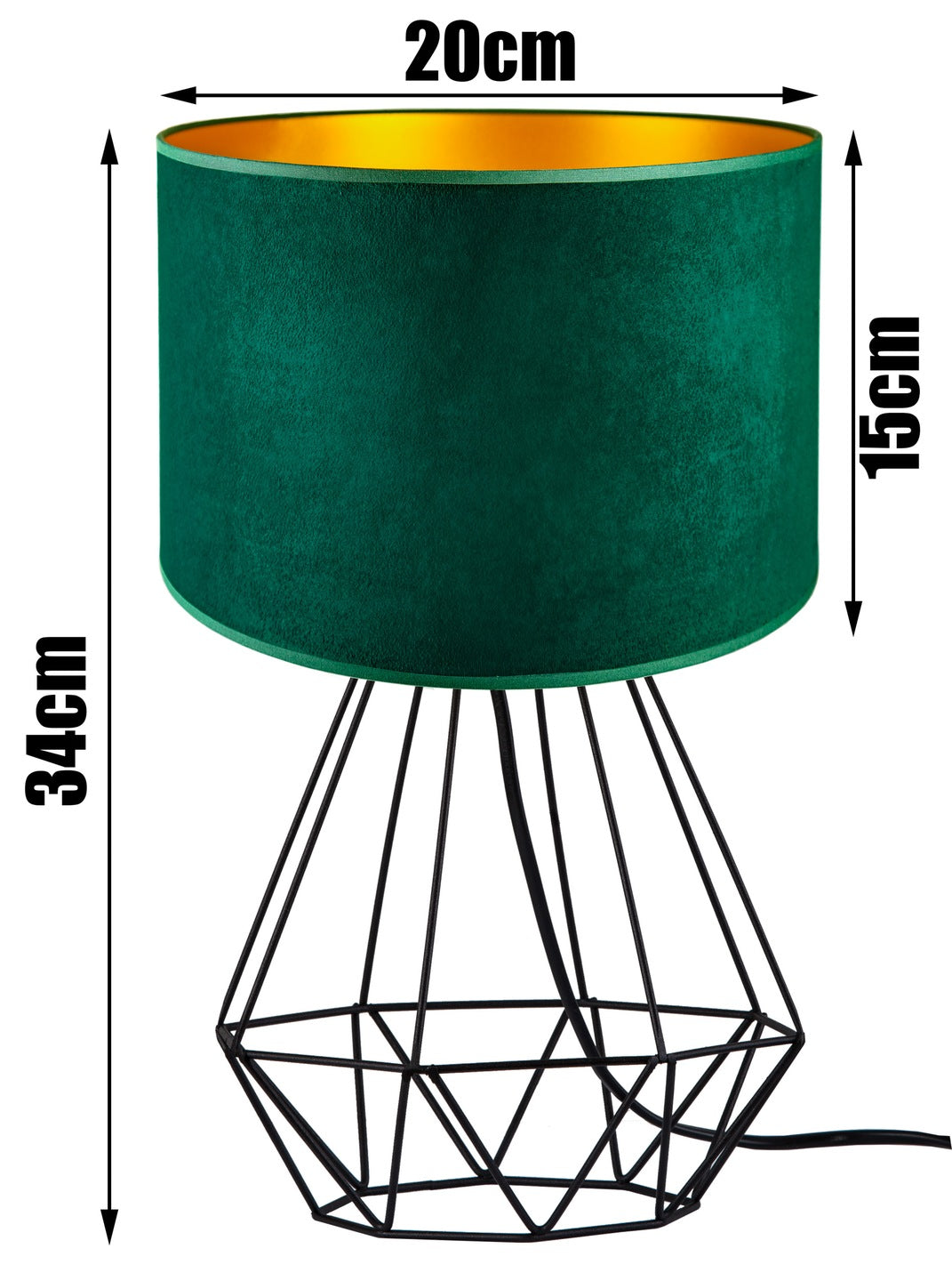 Moderne Nachttischlampe im Loft-Stil mit elegantem grün-goldenem Schirm. Der Lampenrahmen besteht aus pulverbeschichtetem Metall und der Schirm ist mit einem samtartigen Stoff auf PVC-Folie bezogen. Die Lampe ist bis zu 33 cm hoch und 20 cm breit, während der Schirmdurchmesser 20 cm x 15 cm beträgt. Sie wird mit einer Netzspannung von ~230 [V] betrieben und verfügt über eine E27-Fassung, die die Verwendung von LED-Lampen ermöglicht. Die Lampe hat die Schutzart IP20 und einen Schalter am Kabel. Glühbirnen sind nicht im Lieferumfang enthalten.